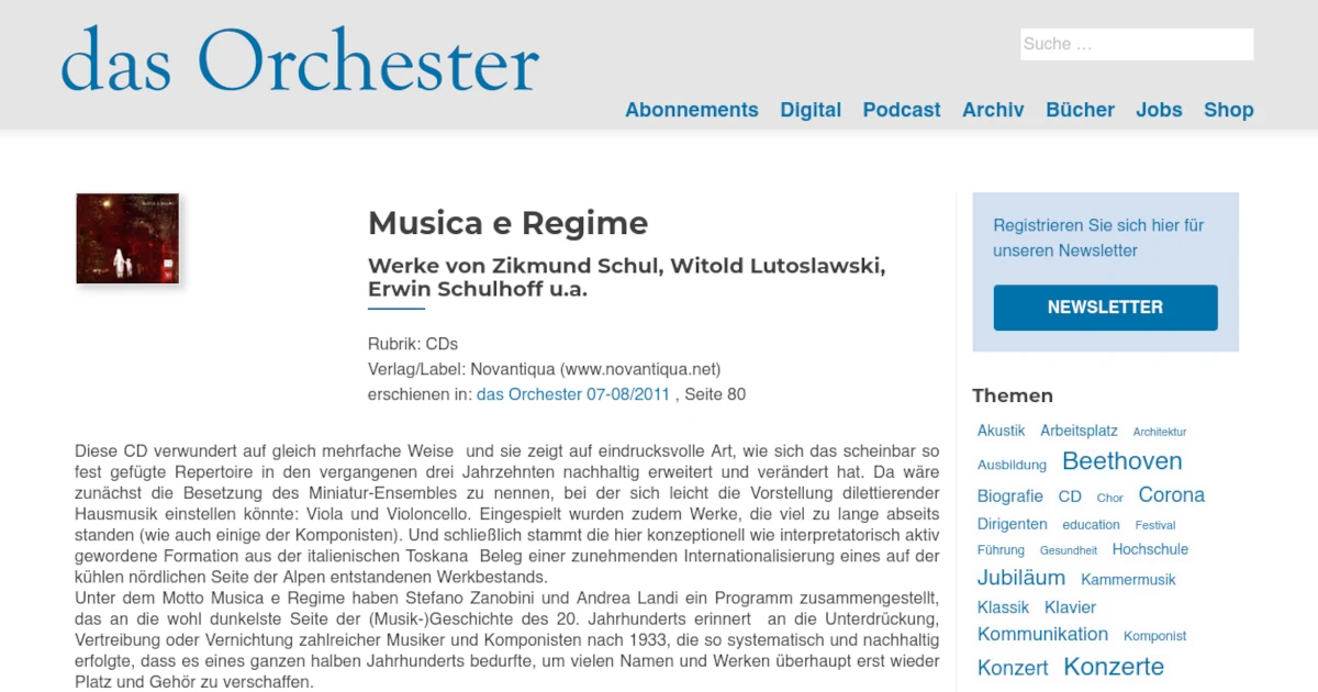 Fifteen years ago, we at NovAntiqua Records embarked on a journey that would define a core part of our mission: to unearth and give new life to forgotten musical treasures. The very first release in our "Musica & Regime" series, featuring the exquisite duo of Stefano Zanobini (viola) and Andrea Landi (cello), was a bold step, and we're proud to revisit a review from the prestigious German magazine Das Orchester that perfectly captured its essence.