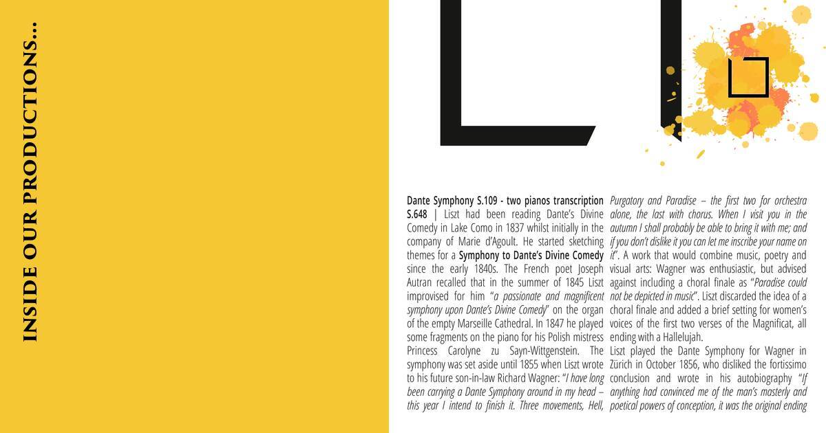 Dante Symphony S.109 - two pianos transcription S.648 | Liszt had been reading Dante’s Divine Comedy in Lake Como in 1837 whilst initially in the company of Marie d’Agoult. He started sketching themes for a Symphony to Dante’s Divine Comedy since the early 1840s. The French poet Joseph Autran recalled that in the summer of 1845 Liszt improvised for him “a passionate and magnificent symphony upon Dante’s Divine Comedy” on the organ of the empty Marseille Cathedral. In 1847 he played some fragments on the piano for his Polish mistress Princess Carolyne zu Sayn-Wittgenstein. The symphony was set aside until 1855 when Liszt wrote to his future son-in-law Richard Wagner: “I have long been carrying a Dante Symphony around in my head – this year I intend to finish it. Three movements, Hell, Purgatory and Paradise – the first two for orchestra alone, the last with chorus. When I visit you in the autumn I shall probably be able to bring it with me; and if you don’t dislike it you can let me inscribe your name on it”. A work that would combine music, poetry and visual arts: Wagner was enthusiastic, but advised against including a choral finale as “Paradise could not be depicted in music”. Liszt discarded the idea of a choral finale and added a brief setting for women’s voices of the first two verses of the Magnificat, all ending with a Hallelujah.