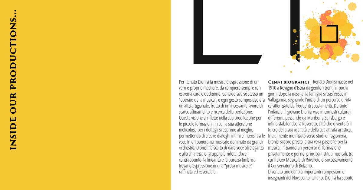 Cenni biografici | Renato Dionisi nasce nel 1910 a Rovigno d’Istria da genitori trentini; pochi giorni dopo la nascita, la famiglia si trasferisce in Vallagarina, segnando l’inizio di un percorso di vita caratterizzato da frequenti spostamenti. Durante l’infanzia, il giovane Dionisi vive in contesti culturali differenti, passando da Maribor a Salisburgo e infine stabilendosi a Rovereto, città che diventerà il fulcro della sua identità e della sua attività artistica. Inizialmente indirizzato verso studi di ragioneria, Dionisi scopre presto la sua vera passione per la musica, iniziando un percorso di formazione privatamente e poi nei principali istituti musicali, tra cui il Liceo Musicale di Rovereto e, successivamente, il Conservatorio di Bolzano.