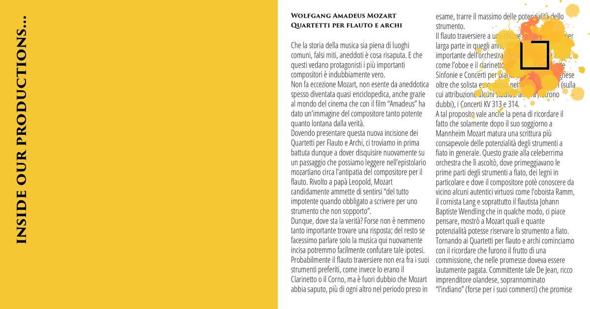 Dovendo presentare questa nuova incisione dei Quartetti per Flauto e Archi, ci troviamo in prima battuta dunque a dover disquisire nuovamente su un passaggio che possiamo leggere nell’epistolario mozartiano circa l’antipatia del compositore per il flauto. Rivolto a papà Leopold, Mozart candidamente ammette di sentirsi “del tutto impotente quando obbligato a scrivere per uno strumento che non sopporto”.
