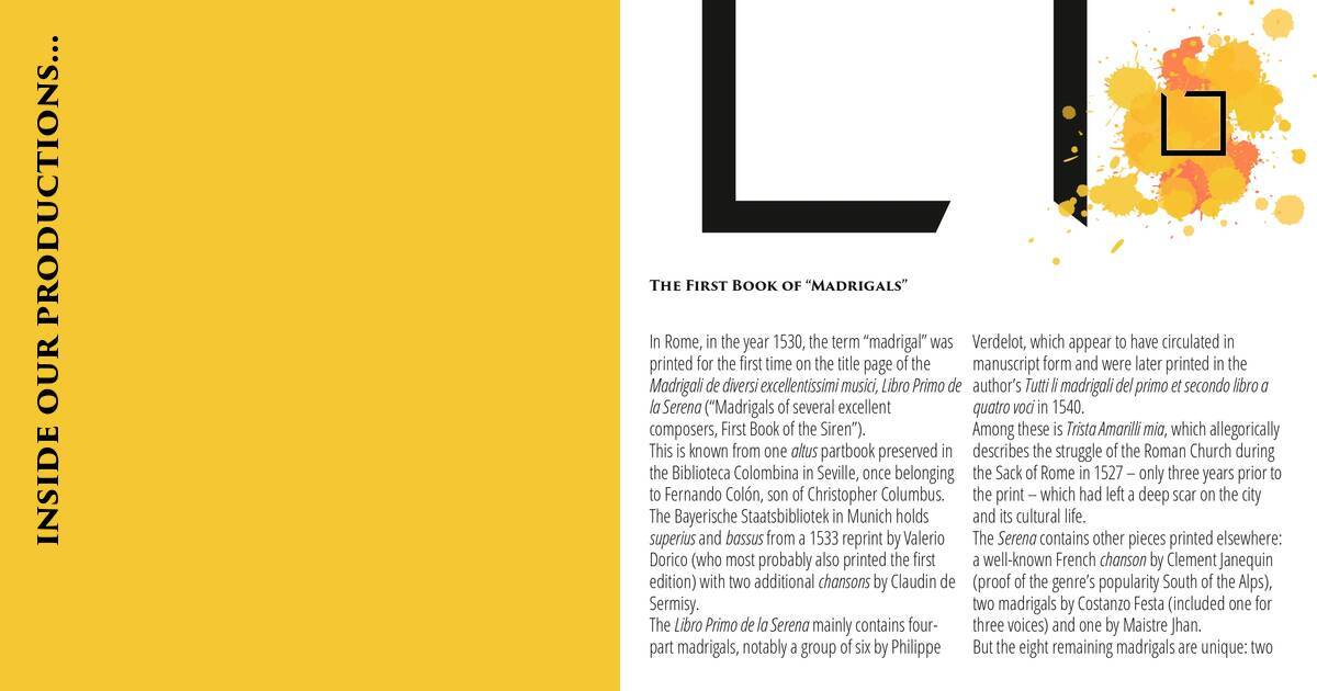 In Rome, in the year 1530, the term “madrigal” was printed for the first time on the title page of the Madrigali de diversi excellentissimi musici, Libro Primo de la Serena (“Madrigals of several excellent composers, First Book of the Siren”).