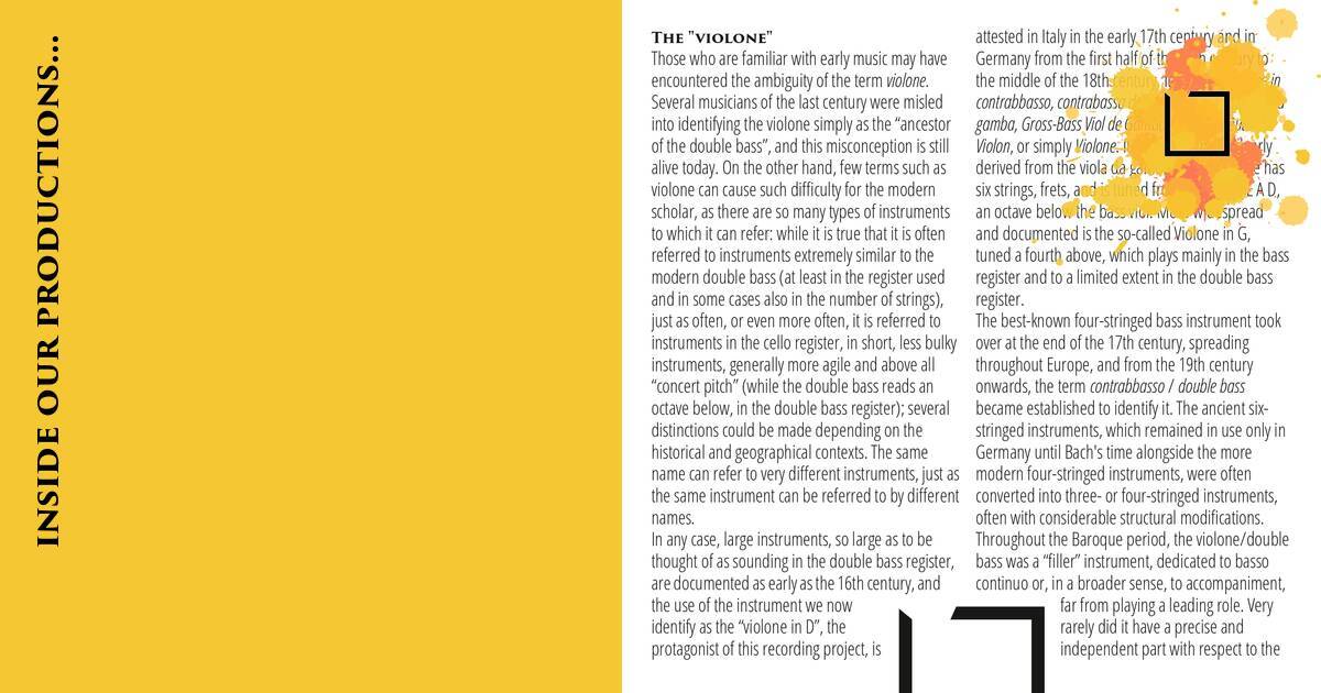 Ad ogni modo strumenti di grosse dimensioni, tanto da far pensare a strumenti contrabbassi, sono documentati già nel XVI secolo ed è attestato l’uso dello strumento che oggi identifichiamo come “violone in Re”, protagonista di questo progetto discografico, in Italia a inizio XVII secolo, e in Germania dalla prima metà del XVII secolo fino alla metà del XVIII secolo. Viene chiamato Violone in contrabbasso, contrabassa da gamba, Contrabbasso da gamba, Gross-Bass Viol de Gamba, Violono, Deutsche Violon, o semplicemente Violone. Si tratta di uno strumento di chiara derivazione gambistica, e dunque a sei corde, provvisto di tasti, accordato dal grave Re Sol Do Mi La Re, un’ottava sotto la viola da gamba bassa. Più diffuso e documentato è invece il cosiddetto Violone in Sol, accordato una quarta sopra, che suona prevalentemente nel registro basso e limitatamente nel registro contrabbasso.