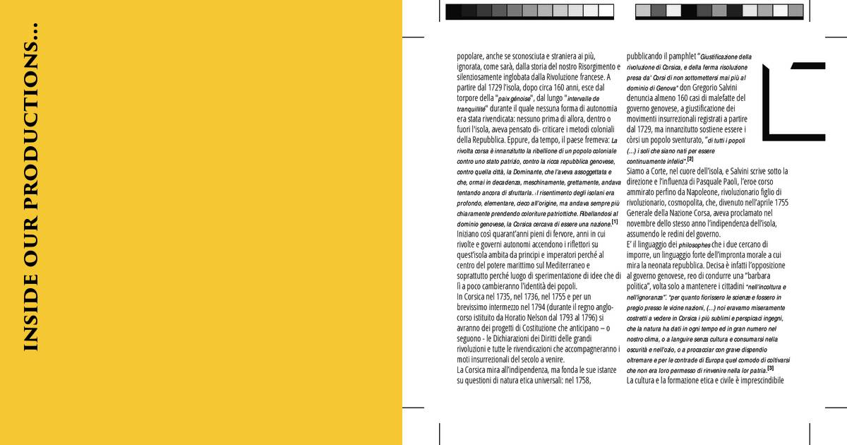 pubblicando il pamphlet "Giustificazione della rivoluzione di Corsica, e della ferma risoluzione presa da' Corsi di non sottomettersi mai più al dominio di Genova" don Gregorio Salvini denuncia almeno 160 casi di malefatte del governo genovese, a giustificazione dei movimenti insurrezionali registrati a partire dal 1729, ma innanzitutto sostiene essere i còrsi un popolo sventurato, "di tutti i popoli (...) i soli che siano nati per essere continuamente infelici".[21 Siamo a Corte, nel cuore dell'isola, e Salvini scrive sotto la direzione e l'influenza di Pasquale Paoli, l'eroe corso ammirato perfino da Napoleone, rivoluzionario figlio di rivoluzionario, cosmopolita, che, divenuto nell'aprile 1755 Generale della Nazione Corsa, aveva proclamato nel novembre dello stesso anno l'indipendenza dell'isola, assumendo le redini del governo. E' il linguaggio dei philosophes che i due cercano di imporre, un linguaggio forte dell'impronta morale a cui mira la neonata repubblica. Decisa è infatti l'opposizione al governo genovese, reo di condurre una "barbara politica", volta solo a mantenere i cittadini "nell'incoltura e nell'ignoranza": "per quanto fiorissero le scienze e fossero in pregio presso le vicine nazioni, (...) noi eravamo miseramente costretti a vedere in Corsica i più sublimi e perspicaci ingegni, che la natura ha dati in ogni tempo ed in gran numero nel nostro clima, o a languire senza cultura e consumarsi nella oscurità e nell'ozio, o a procacciar con grave dispendio oltremare e per le contrade di Europa quel comodo di coltivarsi che non era loro permesso di rinvenire nella lor patria.t31 La cultura e la formazione etica e civile è imprescindibile